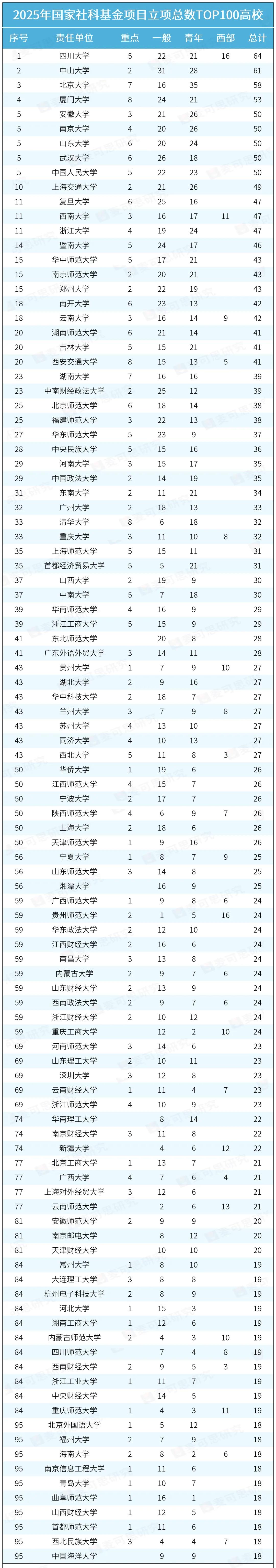 其他获得重点项目立项较多的高校还有北京大学、湖南大学,均为7项,山东大学、武汉大学、复旦大学、南开大学、湖南师范大学、北京师范大学,均为6项。