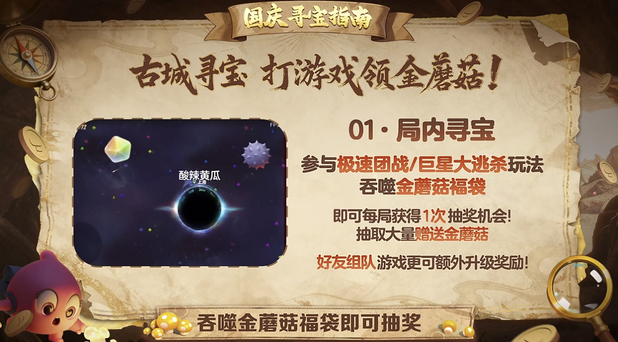 这不仅仅是技术的比拼,更是运气与策略的较量。单次对局就有机会爆出超过10,000金蘑菇的超级福袋!快叫上你最默契的队友,制定专属的“淘金”战术,在这个国庆,把打游戏变成一场真正的“掘金之旅”!