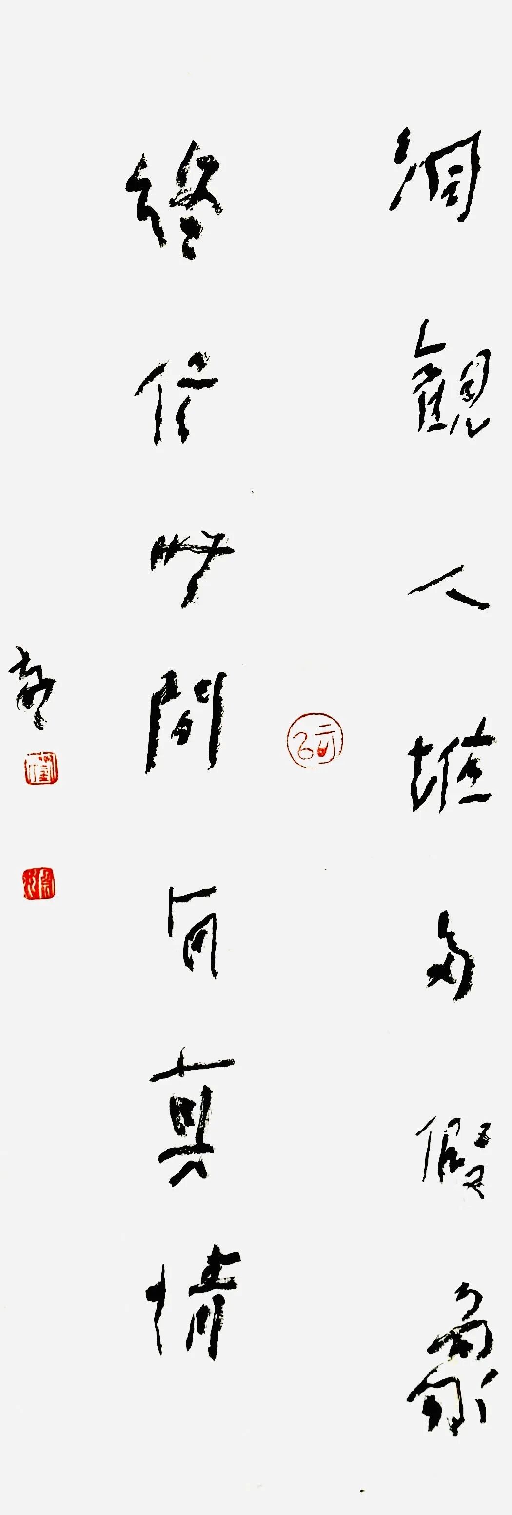 先生之艺,妙在书与画“意趣互通”,非止于技法叠加。其书法作品,常含绘画构图之思,大幅行草章法,取山水画“虚实相生”之理,实处笔墨密集如峰峦叠嶂,虚处留白若云雾缭绕,使书法不单为文字排布,更成“无象之画”。其绘画作品,又尽显书法笔墨之神,即便是小幅花鸟,墨色浓淡、线条粗细,皆循书法“屋漏痕”“锥画沙”之质感,令画面既有丹青之彩,又含笔墨之风骨。此“书为画之骨,画为书之延伸”之艺观,使其作品辨识度独显,字里画间,皆见蜀地之率真洒脱,更含传统笔墨之创造性转化。