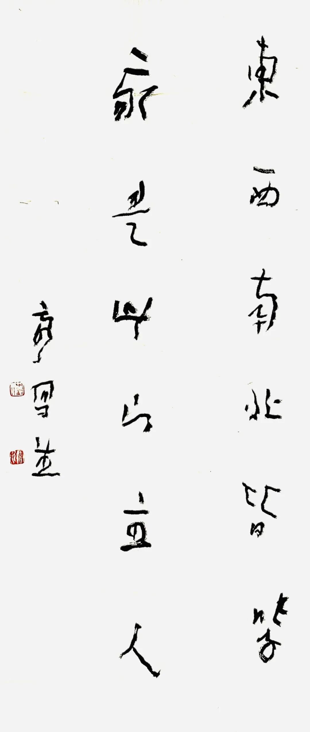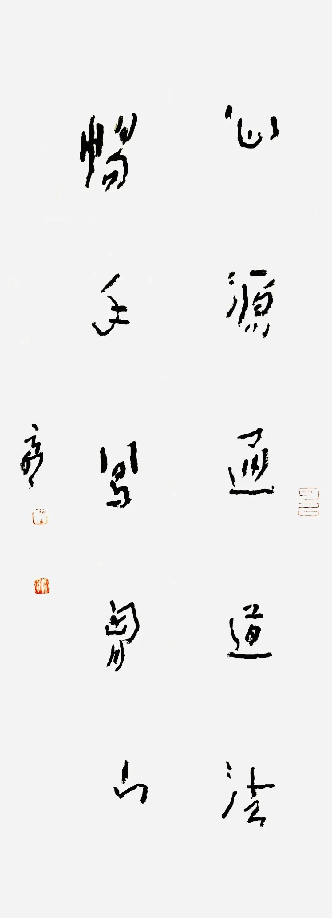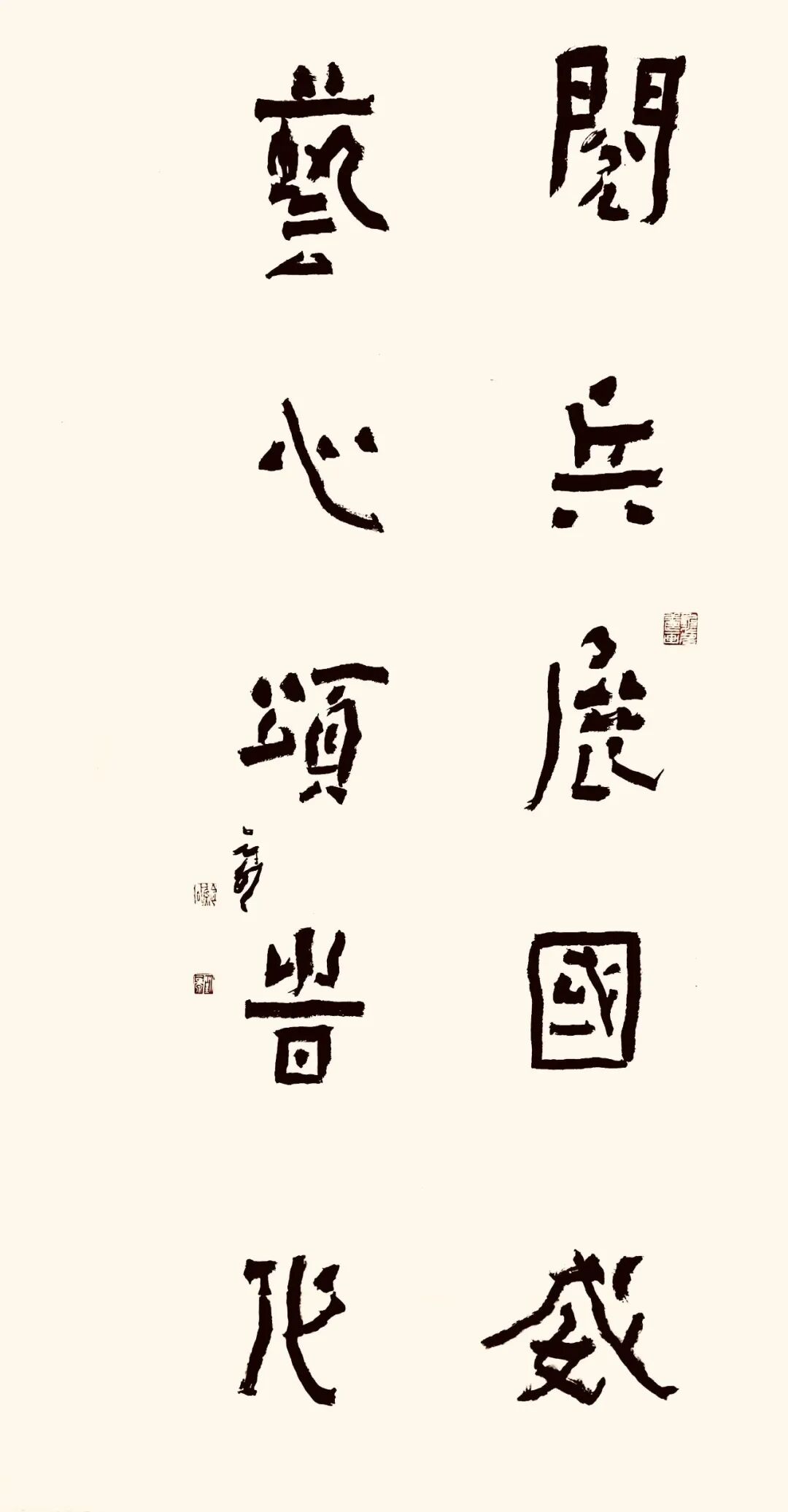 先生早岁负笈四川美术学院绘画系版画专业,于此筑牢艺基。版画一道,苛求线条之精、黑白之对、构图之散聚,此等素养,终成其日后笔墨之膏腴。对“形”与“线”之敏察,既润其书,亦启其画。学成之后,先生先潜研书法,沉潜汉魏碑刻,于《爨宝子碑》之朴厚、《爨龙颜碑》之恢弘,揣摩至深。他破“执笔必中锋”之陈规,以正侧锋交替运笔,使线条稳而不滞,逸而不浮。其行草尤具个性,篆隶古拙之体势,融于灵动笔意之间,字行疏密得当,既存古人风骨,又出己意新趣,恰似蜀中山水,险峻之中含温润之韵。