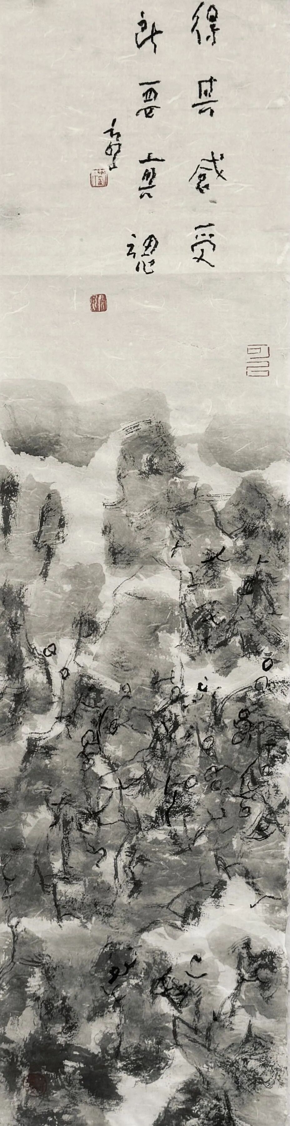 书道既成,其笔墨意趣自然浸润于绘画。先生作画,多涉山水、花鸟,然不泥于传统写实,独辟“以书入画”之径。绘山水时,弃繁复皴擦,以中锋线条勾山石之廓,用侧锋墨色现云雾之层,提按转折间,行草之恣纵与篆隶之沉厚并存,远山近石,似动于纸上,力与空灵兼备。写花鸟时,重“意到笔随”,如笔下兰草,劲挺线条起笔,淡墨晕染收尾,叶片舒展,花茎转折,皆凭书法笔势掌控,不求形肖,独求“空谷幽香”之气韵。先生尝言:“画里的线条,得有书法的‘气’,不然就是死的。”此语道破其画之精髓。