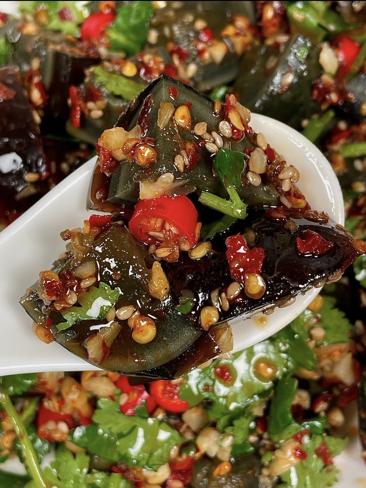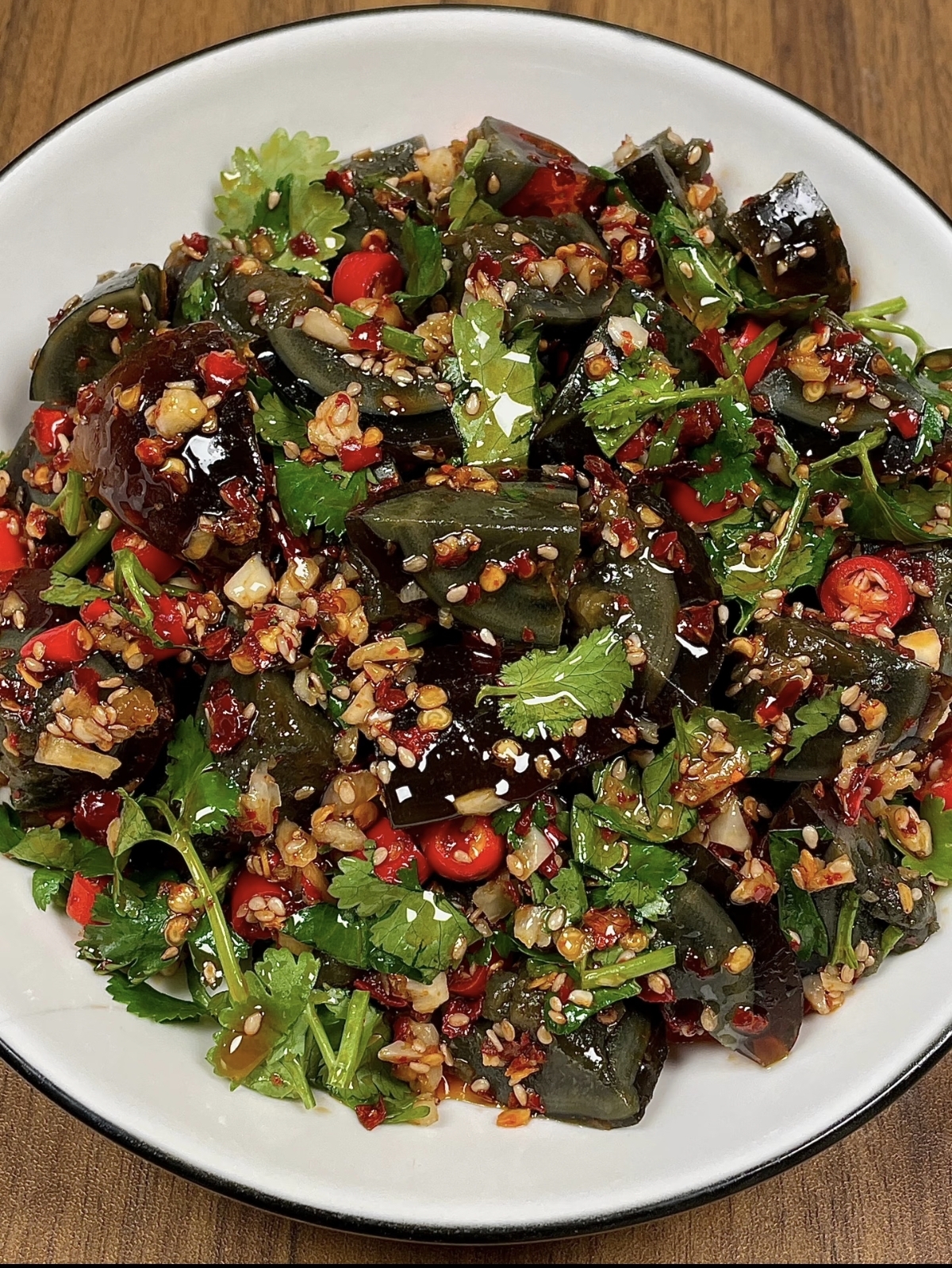 当这道菜端上桌,热气或许不在,但香气却丝毫不减。夹起一块裹满酱汁的皮蛋,Q弹的口感在舌尖跳跃,香菜的清香随之弥漫,再配上一口米饭,简直是绝配。它用最朴实的方式,诠释了家常菜的魅力,让人在每一口中都能感受到生活的美好。愿这道简单的美味,能为你的餐桌增添一份色彩,也为你的生活带来一份小小的惊喜。