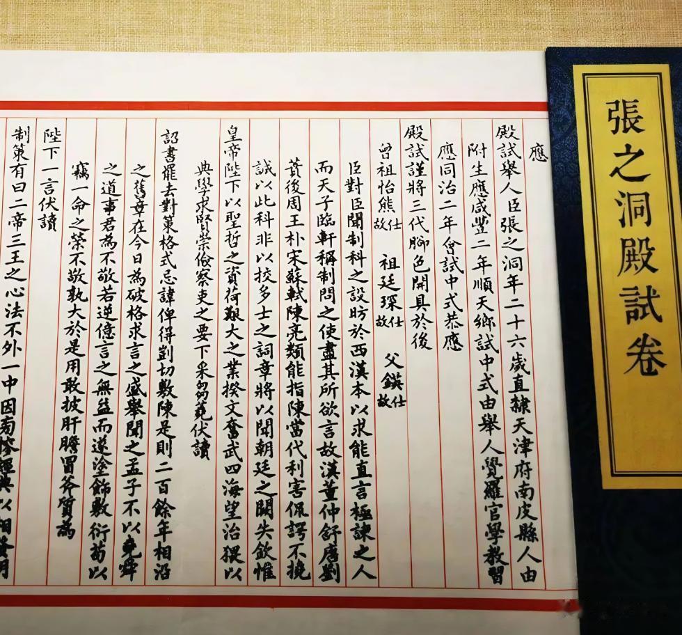 殿试作为古代科举最高等级的考试,不仅考察治国见解,书写工整度更是重要评分标准,张之洞的这份答卷,对仗工整、疏密均匀,字字精致、笔笔严谨,仅凭书写,就足以配得上“探花”头衔。