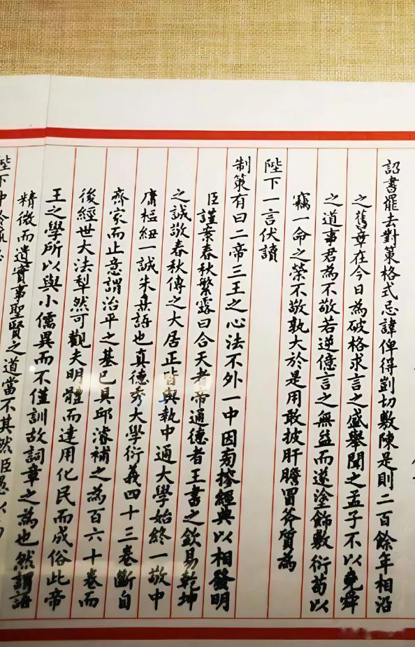 如今,这幅珍贵的殿试策静静陈列在博物馆中,既见证着张之洞的才学与风骨,也展现着晚清馆阁体书法的最高水准,历经百年依旧熠熠生辉。