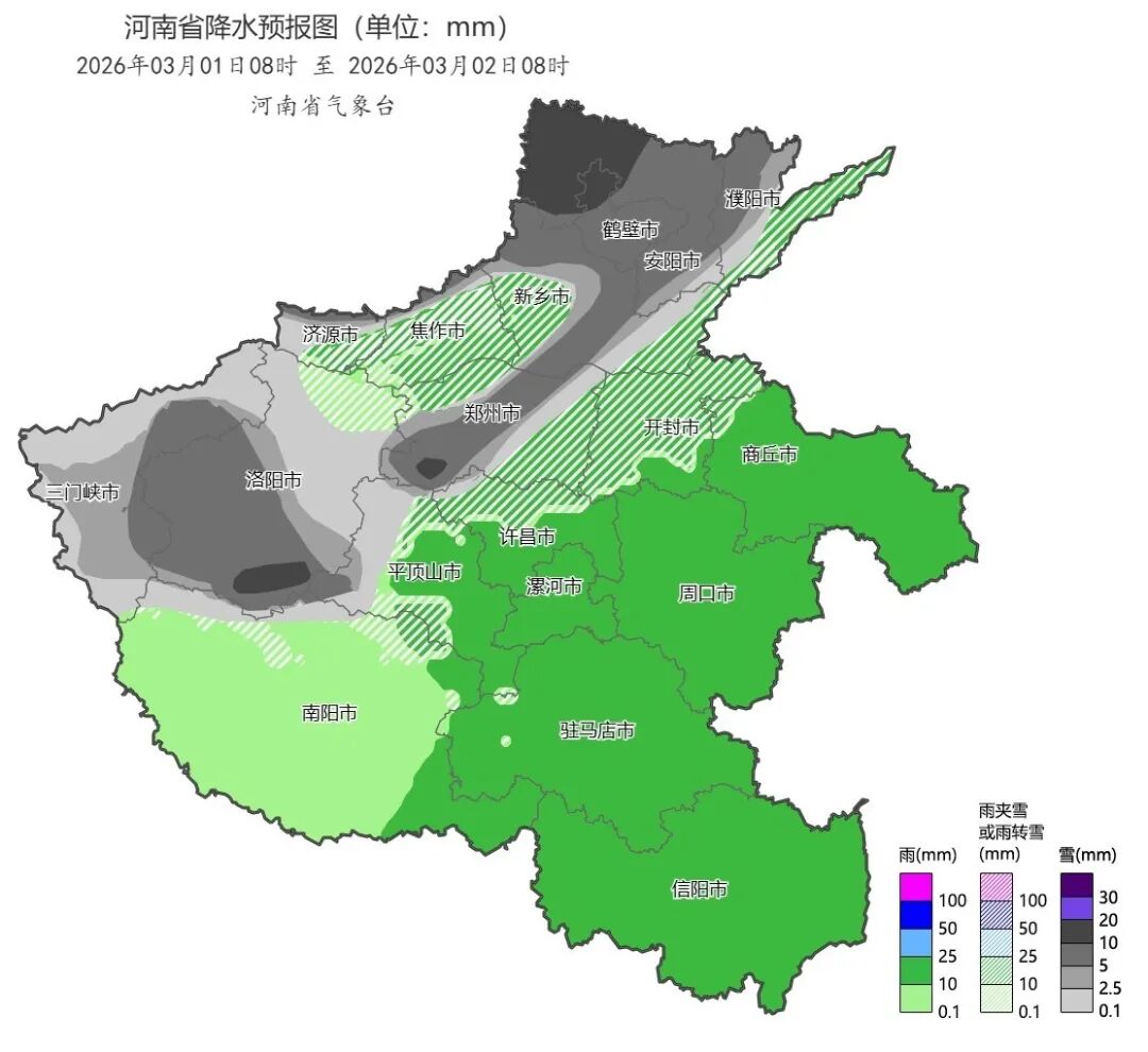随着暖湿气流将水汽源源不断向河南输送,今天雨雪的范围将逐步覆盖到全省。具体来看,今天(3月1日)将进入本轮雨雪的最强时段,全省大部将下起小到中雨,气温较低的西部、北中部会有更多地区由雨转为雨夹雪或小到中雪,尤其是豫北、豫西以及郑州西部部分县市将出现大到暴雪。