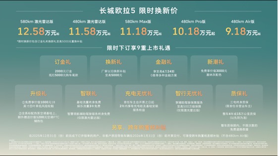 2025年12月16日——今日,长城汽车欧拉品牌全新A级纯电SUV——长城欧拉5正式上市。新车共推出5款配置,建议零售价区间为9.98万至13.38万元,限时换新价9.18万元起(限时换新价包含“订金礼”和“换新礼”至高5000元以旧换新补贴)。为回馈广大用户的热爱与支持,即日起至2025年12月31日,用户下订并锁单即可尊享包含订金礼、换新礼、智行无忧礼在内的9重上市好礼,以及跨年购置税补贴(不含480km Air版)等丰厚购车权益。凭借诚意十足的价格权益与越级产品力,长城欧拉5致力于成为全球年轻用户的“严选搭子”。