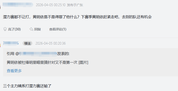 值得一提的是,上一轮潜力赛广东23-19击败上海,那场比赛黄明依也没有登场,如此说来,如今黄明依已经是连续2轮潜力赛被弃用了。杜锋现在是宁愿让没什么潜力空间的张文逸、王少杰、有伤在身的杜润旺去打潜力赛,也不愿给黄明依报名,这样的做法,自然也引来了广东球迷的不满。