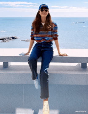 蓝色系条纹Polo衫叠穿白色T恤,增加层次感,搭配九分牛仔裤和小白鞋,用鸭舌帽和墨镜作为配饰点缀,活力又减龄。