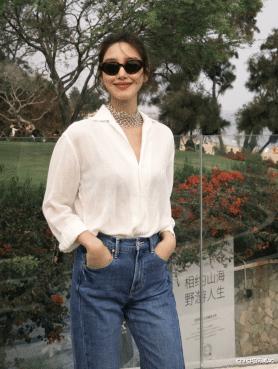 优雅的V领白衬衫搭配直筒款牛仔裤,配上精致钻石配饰,自带松弛与慵懒,杨采钰的私服衣品绝了!
