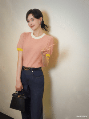 浅西瓜红色针织上衣做了领口与袖口的拼接设计,把穿搭的细节和层次展现出来,下身搭配复古调牛仔裤和金属皮带,老钱风的松弛感get。