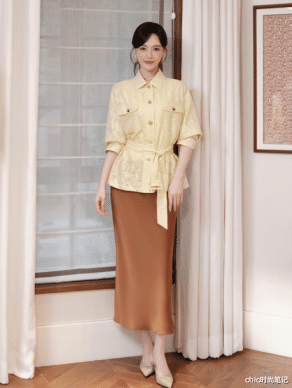 鹅黄色衬衫上衣搭配棕色缎面半身裙,整体都是黄色系演变而成,脚上的裸色高跟鞋呼应了穿搭的色彩搭配技巧,既不会头重脚轻,也不会让深色系或者两色系颜色抢镜。