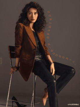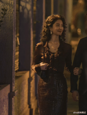 剧中的杨采钰简直是时髦精!棕色荷叶边修身上衣搭配鳄压纹半身皮裙,把成熟女性的性感与曲线体现得恰到好处,配上卷发与钻石配饰,精致、摩登。