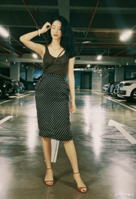 吊带+波点半身裙+红色高跟凉鞋,复古元素与色系叠满,配上杨采钰的标志性法式卷发,直接拿捏优雅与成熟。