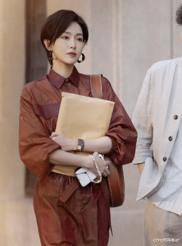 剧中唐嫣身穿Hermes春夏系列连衣裙,带着职场的凛冽和干练,搭配同品牌橙色单肩包,短发造型+夸张耳环更衬职场女性的气场。