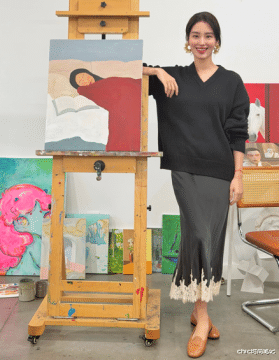 黑色针织上衣版型宽松,搭配缎面蕾丝半身裙提升精致度,all black穿搭容易显沉闷,黄色浮夸花朵造型耳饰来增加色彩魅力。