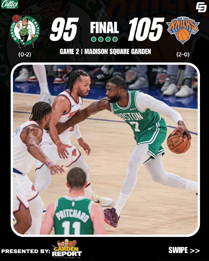 首节比赛,凯尔特人还占据上风,一度领先8分,但到了次节,绿军单节仅得到14分,还让尼克斯拿到42分,单节净负28分,半场就已经落后到20分。第三节,尼克斯继续保持大比分领先,最多领先24分,虽然又被绿军打了一波12-0,但还是手握两位数的领先优势,最终也轻松取胜。