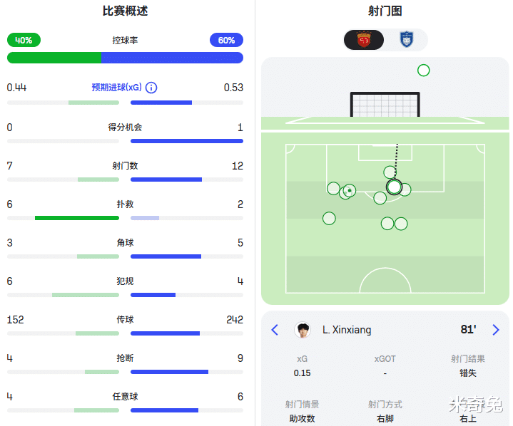 最后时刻,穆斯卡特试验了维塔尔+张源的技术中场组合,背后更是安排了出球中卫张琳芃,球队中后场的推进能力大大提升,甚至打出一波进攻小高潮。李新翔在射门机会预期进球达到0.15,可惜没有把握住。