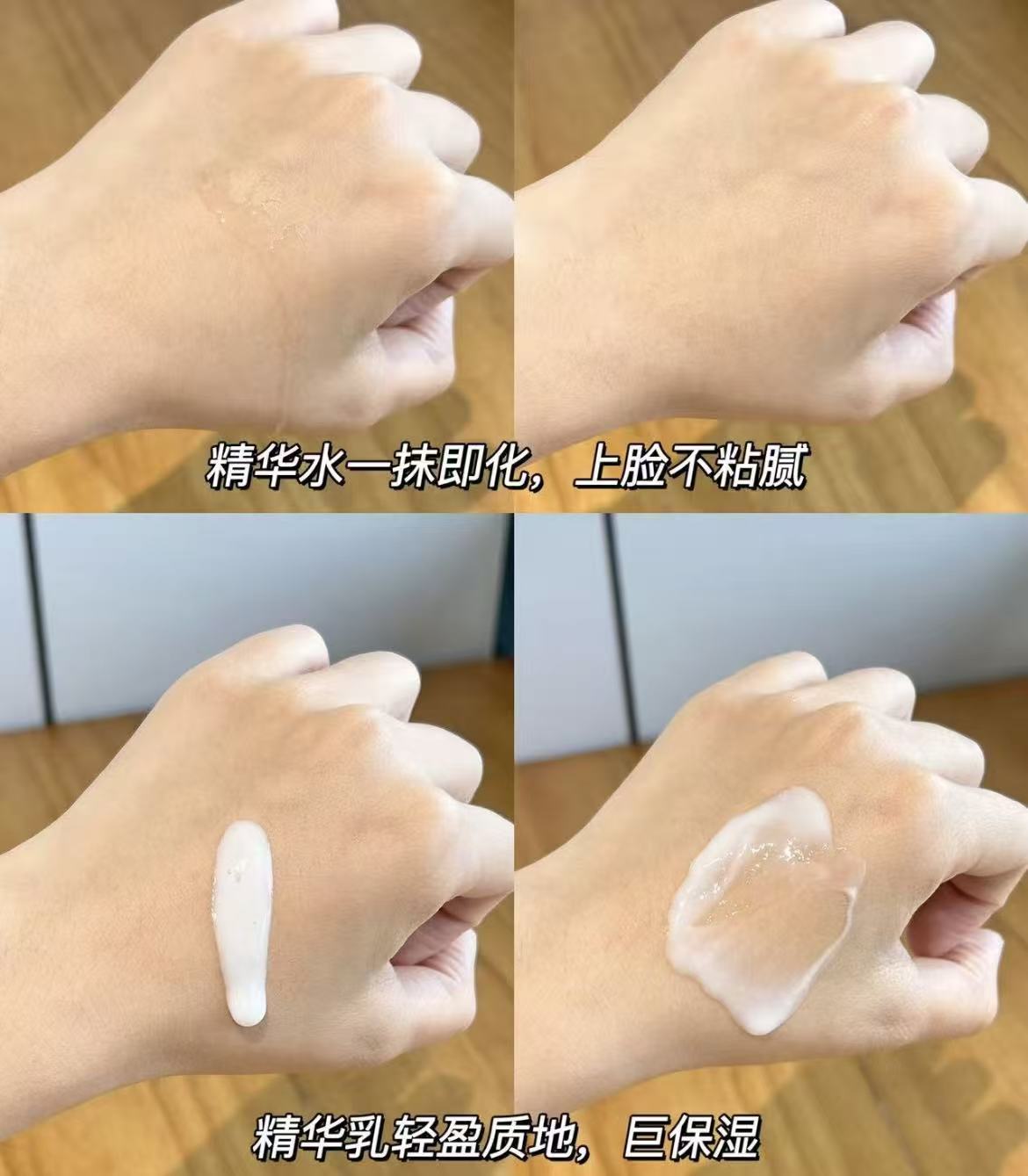 质地:爽肤水为清爽的流动质地,无黏腻残留;乳液为轻薄的乳白色质地,推开后呈哑光状态,后续叠加防晒、隔离也不会搓泥,适合晨间快速护肤。