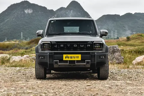 新车延续 “纵横之道” 设计语言,保留标志性 “方盒子” 轮廓,车身线条硬朗棱角分明。前脸最明显的变化是取消前雾灯区域竖条幅装饰,整体造型更简洁。非封闭式格栅采用粗壮横向饰条分隔,中央镶嵌 “JETOUR” 字母标识,配合隆起的引擎盖筋线强化力量感。格栅两侧的纵横矩阵式大灯内置双透镜,LED 日间行车灯形成 “獠牙” 效果,夜间点亮后辨识度较高。