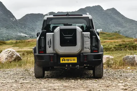 车尾延续经典硬派元素,全系标配外挂式备胎罩(“小书包” 设计),中央保留品牌标识,配合纵向布局的透明尾灯组,越野氛围浓厚。尾灯采用全 LED 光源,内部点阵式灯珠排列,刹车时呈现渐进式点亮效果,雨雾天气穿透力较好。