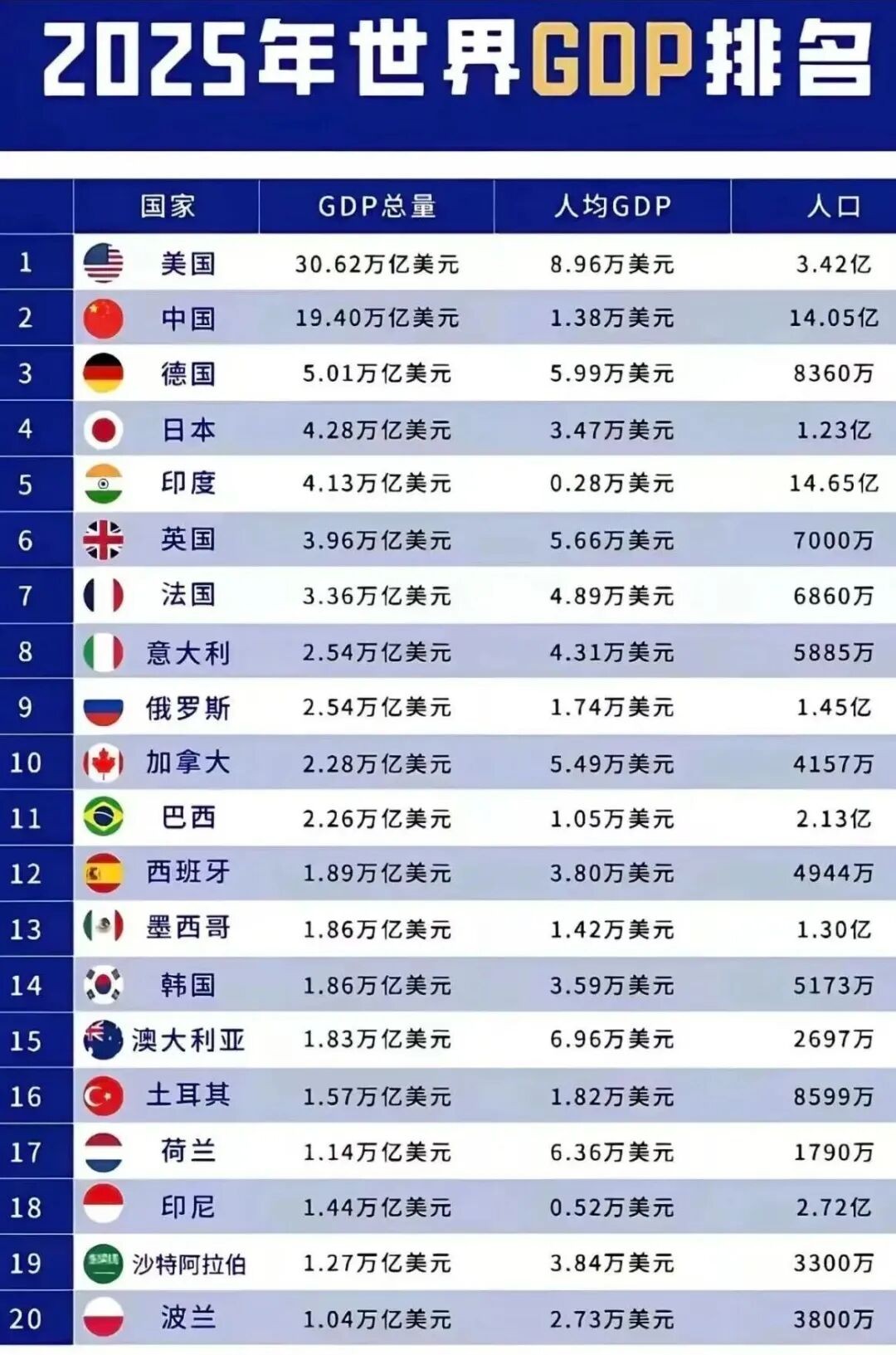 2025年,我国GDP第一次登上140万亿元的台阶,涨到了1401879亿元,且实际增长速度是5%,折合后约为美金19.4万亿元,仅低于美方30.62万亿美元的GDP。