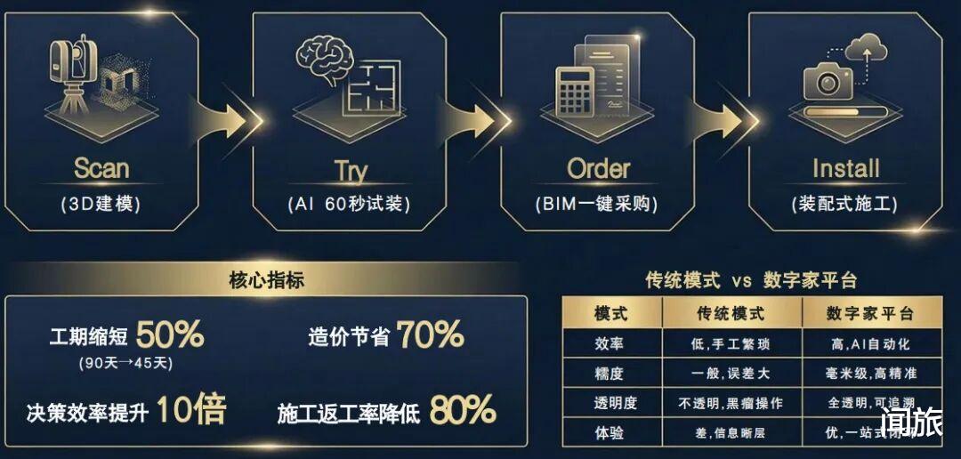 ●数字化降维打击: 依托“数字家”平台,AI在60秒内就能生成基于确认的数字样板间效果的采购清单,不用再折腾漫长的图纸会审,还能在平台下单“一键采买”。