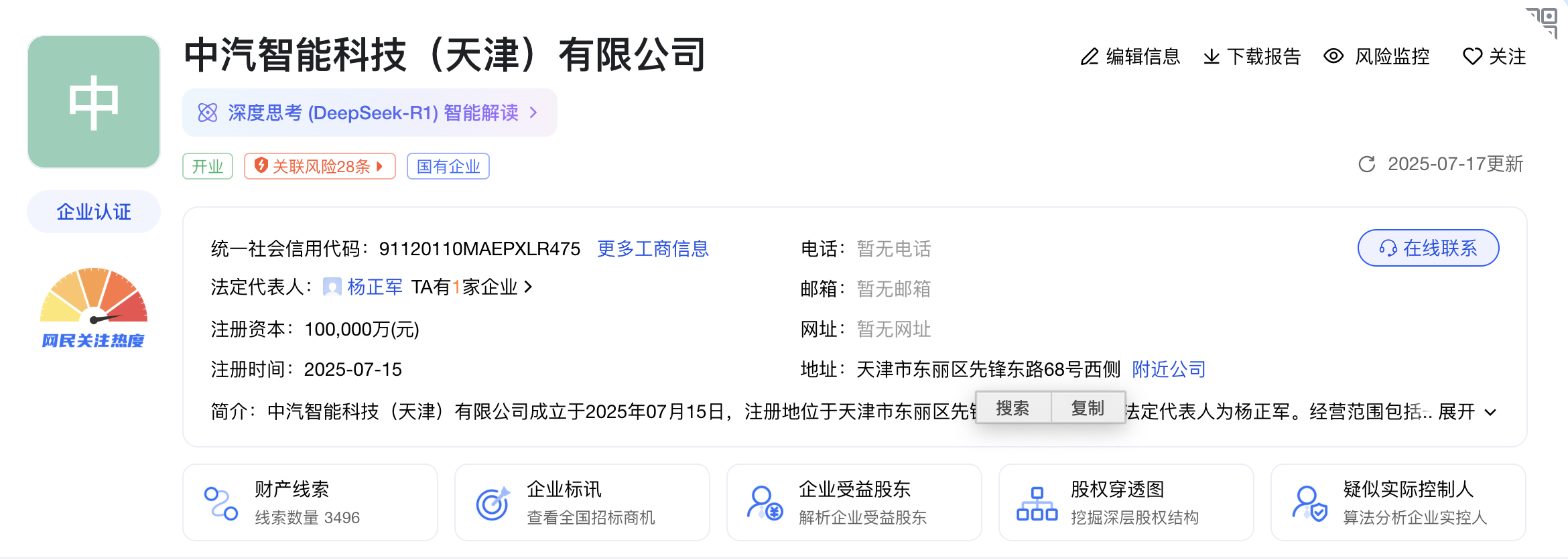 近日,中汽智能科技(天津)有限公司成立,注册资本10亿元,由中汽中心全资控股,聚焦智能车载设备、AI硬件及数据平台研发。