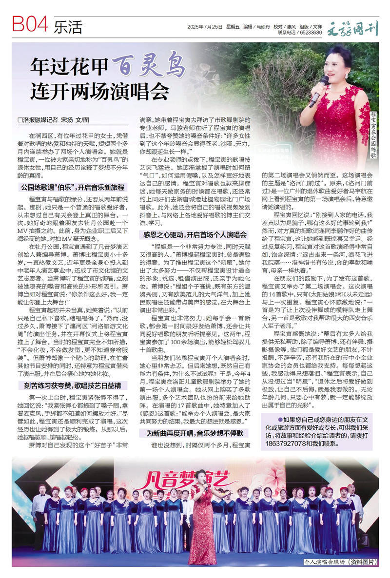 两个月,两场盛会。从“物华天宝寅春锦绣”的感恩之音到《洛河门前过》的新歌首唱,程宝寅以歌声为纽带,将商界精英与文艺翘楚的双重身份交织成璀璨华章。这位被誉为“洛阳最美女高音”的女企业家、军嫂,用艺术才华与社会担当,为古都洛阳的文化天空注入新的光芒。今日,洛阳晚报专访程宝寅,解码她以奋斗与热爱书写的人生答卷,探寻这位跨界女性如何在商海与舞台间绽放出独特的光彩。