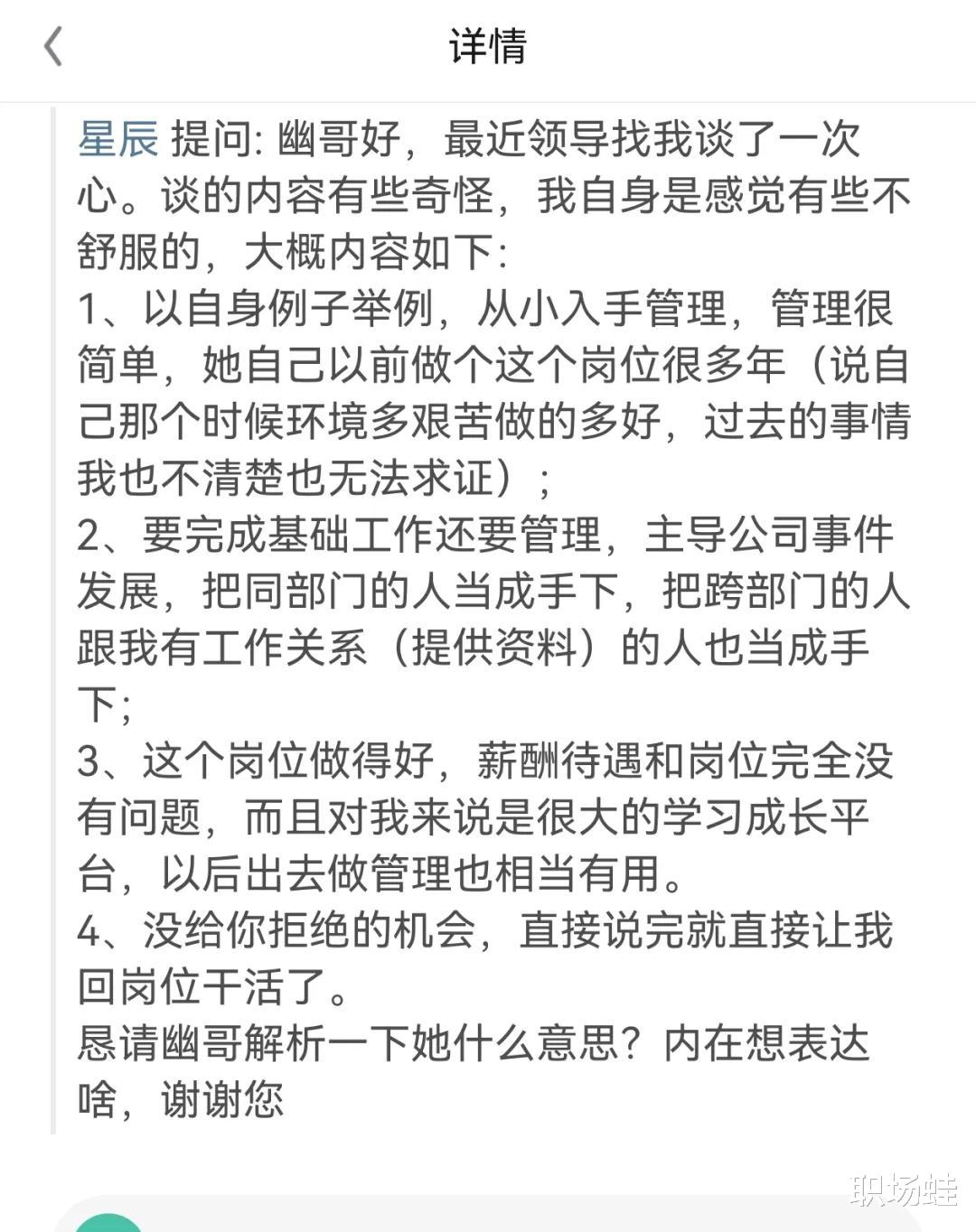“幽哥好,最近领导找我谈了一次心。谈的内容有些奇怪,我自身是感觉有些不舒服的,”