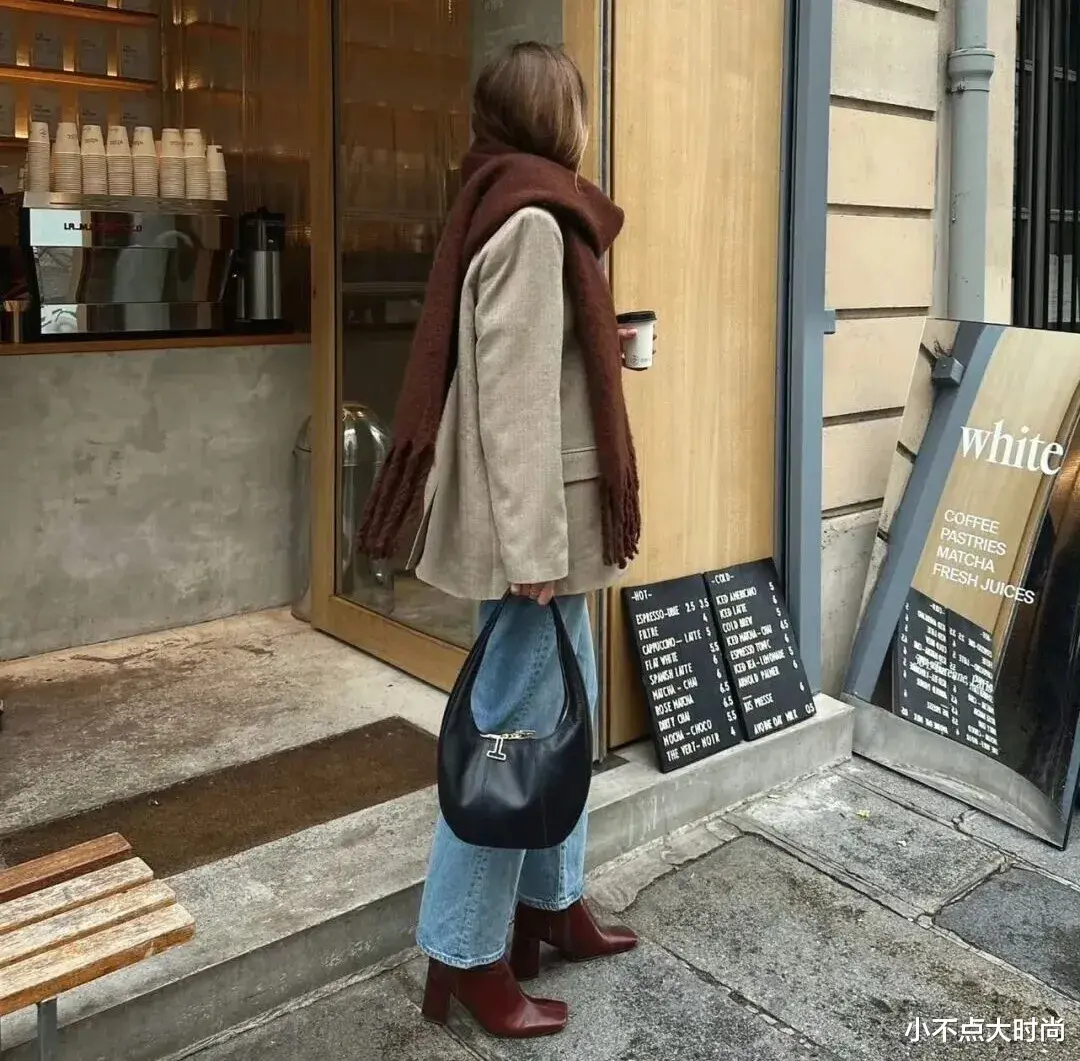 简约的牛仔直筒九分裤,搭配酒红色的短靴,利落又复古的腔调,一条酒红色的围巾为穿搭增添了温暖也呼应了短靴的颜色,让整套搭配时尚又有细节延伸的高级感。▼