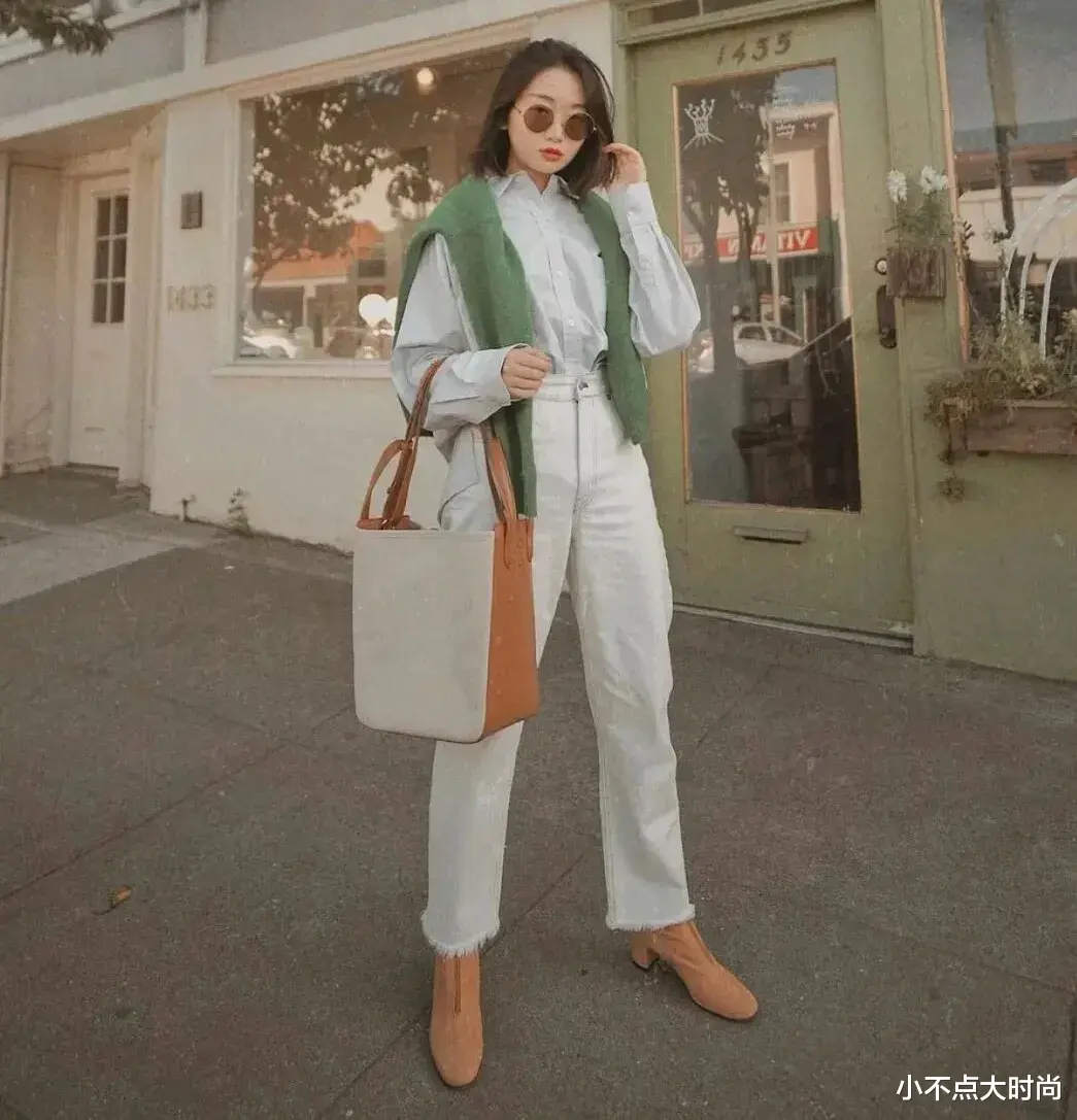白色的九分直筒裤搭配驼色的短靴,提高腰线,小个子十足地显高。上身搭配的也是白色的衬衫,简约又适合通勤的穿搭。用一件绿色的针织衫当披肩来点缀穿搭,增添时尚感和秋冬氛围感。▼