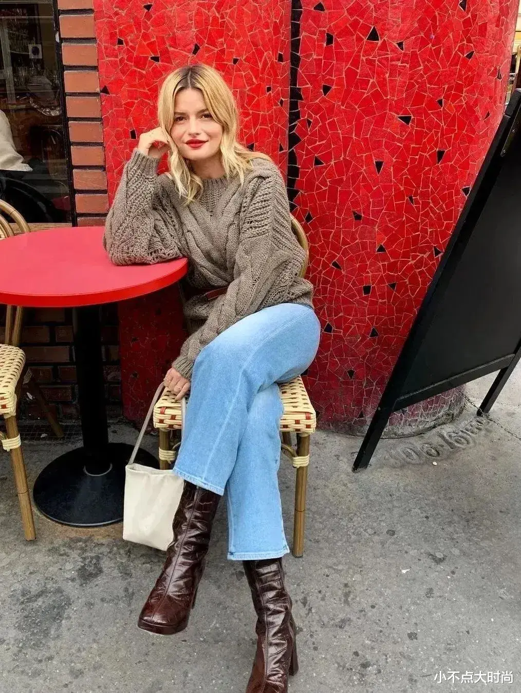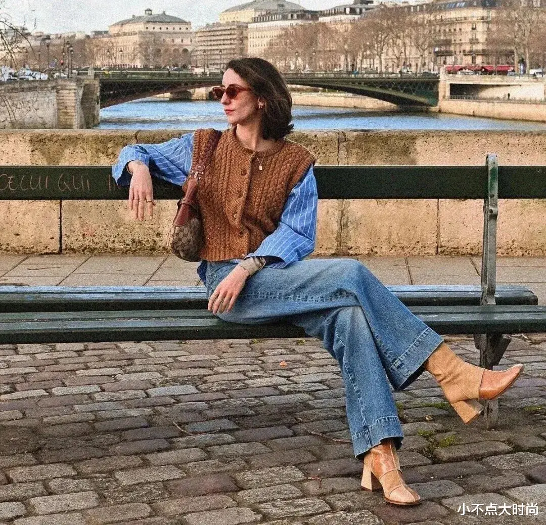浅棕色的拼接麂皮绒短靴,搭配蓝色牛仔裤,复古又时髦的秋冬氛围感搭配,上身穿的蓝色竖条纹衬衫搭配棕色毛衣马甲也是文艺风的,一整套风格协调,复古文艺的气质风。▼