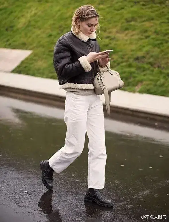 红棕色的皮质短靴复古又洋气,搭配同色系的短款皮衣外套,一整个帅气时髦的气质相呼应。短靴搭配深色的折成九分的直筒裤,显高显瘦,一整套复古利落、优雅得体的穿搭。▼