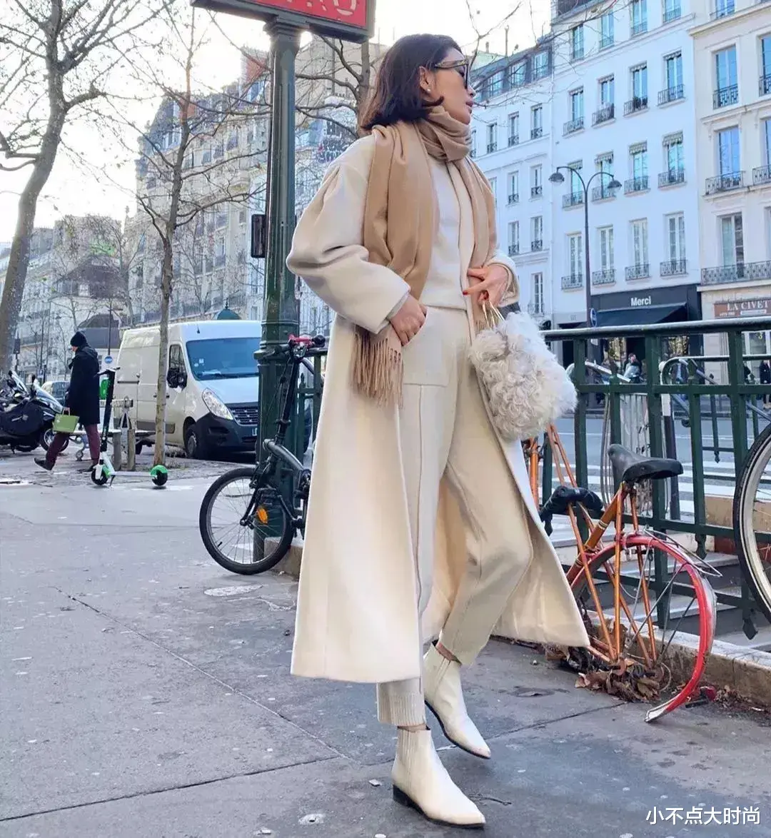 米白色的九分裤搭配米白色的气质短靴,靴子的尖头加窄型设计尽显优雅的女性魅力,上身搭配白色的大衣也是优雅气质风的,一整套风格呼应、知性优雅的简约气质范。▼
