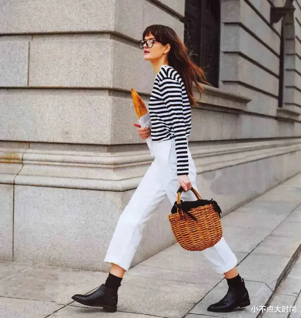 也可以把上衣塞进高腰九分裤内,提高腰线,轻松打造出大长腿的既视感,再搭配一双利落有范的短靴,显高又有时尚感,简约又出气质。▼