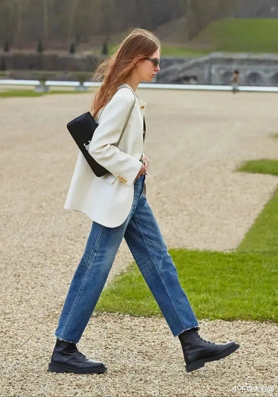简约的蓝色九分裤搭配黑色的短款马丁靴,简洁利落,又有几分休闲的飒爽,中和了上身西装的正式感,让搭配更显时髦,耐看不乏味。▼