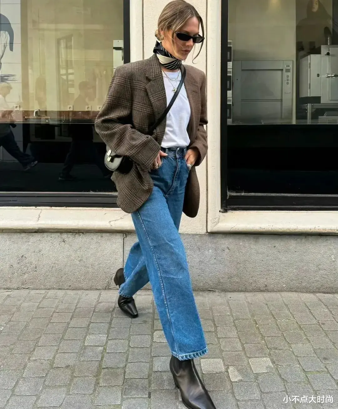 蓝色牛仔九分裤搭配黑色短靴,上身搭配格纹的西装外套,一整套英伦范十足的利落穿搭。丝巾点缀搭配,增添了精致感和时尚感,尽显高级的品位。▼