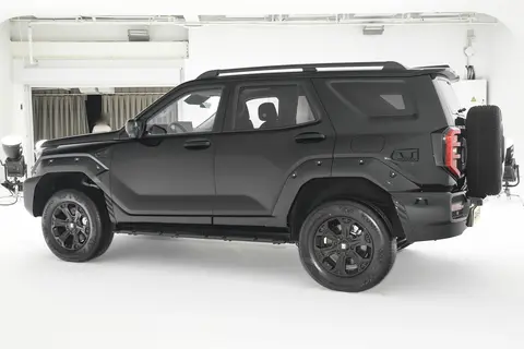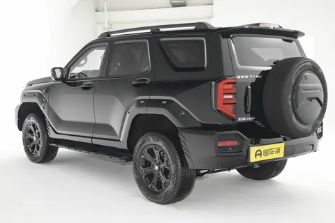 侧面轮眉饰以铆钉细节,Hi4-T智享版配备电动侧踏,Hi4-Z智享版为固定侧踏,全系标配18英寸轮辋。车尾延续外挂式备胎,升级新样式备胎罩(螺栓固定,支持个性化改装),尾标布局优化,上方“GWM TANK”和“长城汽车”标识,下方“坦克400”及动力标识,机械感十足。
