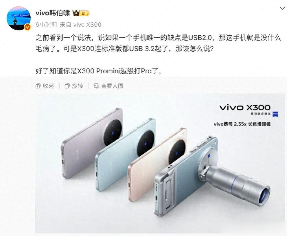 今天,vivo通信科技有限公司产品经理韩伯啸在最新的预热中提到,“之前看到一个说法,说如果一个手机唯一的缺点是USB2.0,那这手机就是没什么毛病了。可是X300连标准版都USB 3.2起了,那该怎么说?好了知道你是X300 Pro mini越级打Pro了”。