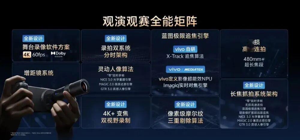 蓝图影像芯片V3+与天玑9500 SoC实现“双芯合体”,配合自研影像芯片 VS1,双芯协同架构性能大幅提升的同时,带来了独家影像体验,行业首发4K 60fps电影人像视频。