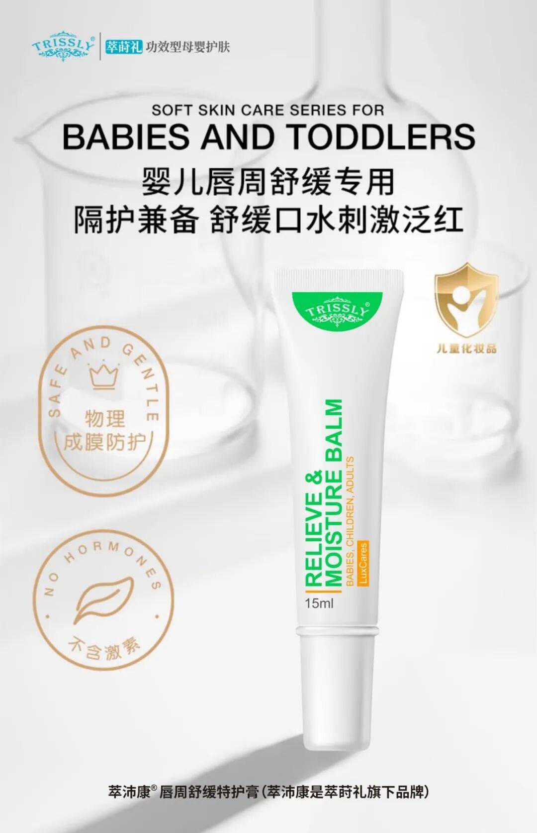 第二步是选对专用护理产品。推荐用萃莳礼唇周舒缓特护膏(俗称小绿管),它是儿童专用化妆品,无激素、无防腐剂,宝宝不小心舔到也安全。它能快速成膜隔离口水和食物汁水,还添加了神经酰胺、向日葵籽油不皂化物等成分,既能修护受损皮肤,又能长效保湿。
