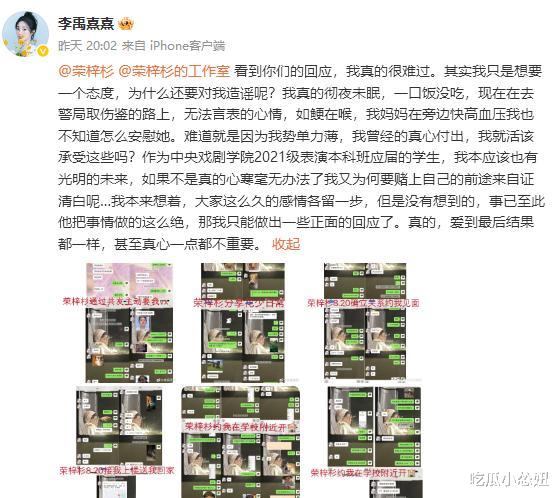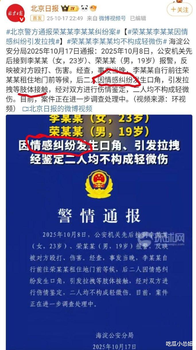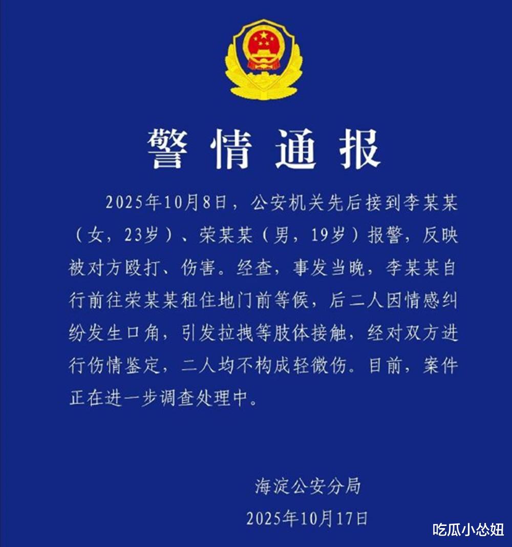 10月17日晚10点,北京海淀警方亲自官宣了荣梓杉与李禹熹的恋情,官方的通报是:李某某、荣某某因情感纠纷发生口角、引发拉拽,经鉴定二人均不构成轻微伤。