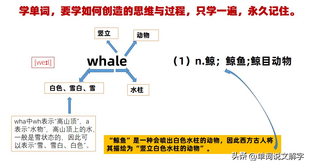 如果你知道西方古人创造白色对应的单词是根据高山上的积雪而创造的白色,大家就会明白为什么“white白色”会与“高山alp”这些单词是一组了!只要大家知道鲸鱼是会喷白色水花的鱼,那我们也很容易理解,“whale 鲸;鲸鱼”其实就是基于“white白色”创造而来!如果我们能够将这一组单词放在一起背,不仅我们可以牢记他们,我们还会发现古人是如何观察世界上的万事万物的,这是非常重要的,大家知道为什么西方在200年前突然集中出现了大量的科技人才吗?为什么他们可以将我们世界进行改变吗?牛顿先生说他是站在巨人肩膀上展翅飞翔的,知道这个巨人是谁吗?只要大家认真阅读完文章,也许大家就找到了答案。