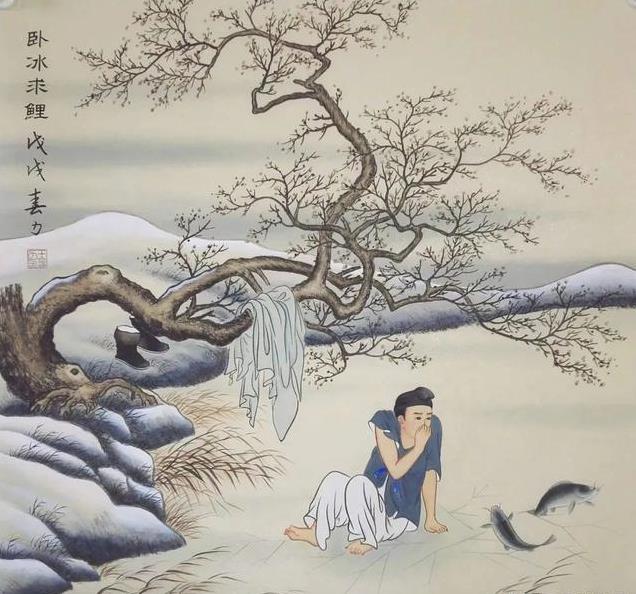 王祥,琅琊人,生母早丧,继母多次在他父亲面前说他坏话,使他失去了父爱。父母患病,他衣不解带侍候,继母想吃活鲤鱼,适值天寒地冻,他解开衣服卧在冰上,冰忽然自行融化,跃出两条鲤鱼,继母食后,果然病愈,王祥隐居二十余年。