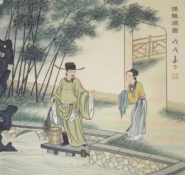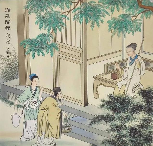 姜诗,东汉人,娶庞氏为妻,夫妻孝顺,其家距长江六七里之遥。庞氏常到江边取婆婆喜欢喝的长江水,婆婆爱吃鱼,夫妻就常做鱼给她吃。婆婆不愿意独自吃,他们又请来邻居老婆婆一起吃。一次因风大,庞氏取水晚归,姜诗怀疑她怠慢母亲,将她逐出家门。庞氏寄居在邻居家中,昼夜辛勤纺纱织布,将积蓄所得托邻居送回家中孝敬婆婆,其后,婆婆知道庞氏被逐之事,令姜诗将其请回。庞氏回家这天院中忽然喷涌出泉水,口味与长江水相同,每天还有两条鲤鱼跃出,从此庞氏使用这些供奉婆婆,不必远走江边了。