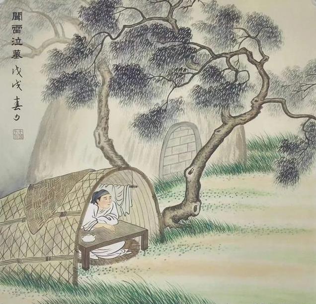 王褏(xiù),魏晋时人,博学多能,父亲王仪被司马昭杀害,他隐居以教书为业,终身不面向西而坐,表示永不作晋臣,其母在世时怕雷,死后埋葬在山林中,每当风雨天气听到雷声,他就跑到母亲坟前,跪拜安慰母亲说:“褏儿在这里,母亲不要害怕。”他教书时,每当读到《蓼(liǎo)莪(é)》篇就常常泪流满面,思念父母。