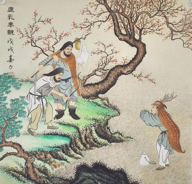 周郯(tán)子,春秋时期人,父母年老患眼疾,需饮鹿乳疗治。他便披鹿皮进入深山,钻进鹿群中,挤取鹿乳,供奉双亲。一次取乳时,看见猎人正要射杀一只麂鹿,郯子急忙掀起鹿皮现身走出,将挤取鹿乳为双亲医病实情告知猎人,猎人敬他孝顺,以鹿乳相赠,护送他出山。
