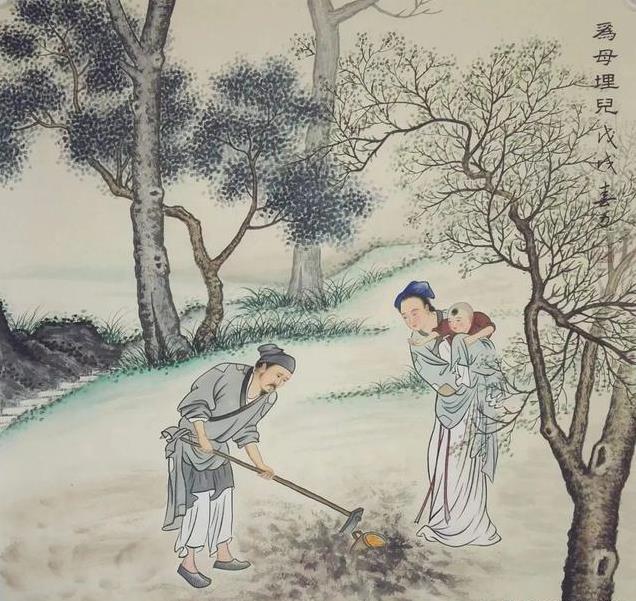 郭巨,晋代隆虑人。原本家道殷实。父死后,他把家产分成两份,给了两个弟弟,自己独取母亲供养,对母极孝,后家境逐渐贫困,妻子生一男孩,郭巨担心,养这个孩子必然影响供养母亲,遂和妻子商议:“儿子可以再有,母亲死了不能复活,不如埋掉儿子,节省点粮食供养母亲。”当他挖坑时,在地下二尺处忽见一坛黄金,上书“天赐郭巨,官不得取,民不得夺”,夫妻得到黄金,回家孝敬母亲,并得以兼养孩子。