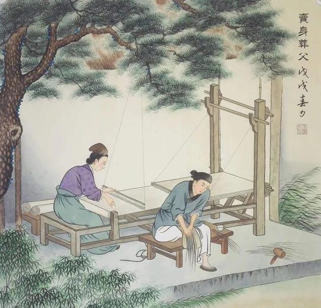 董永,东汉人,少年丧母。因避兵乱迁居安陆,其后父亲亡故,董永卖身至一富家为奴,换取丧葬费用,上工路上于槐荫下遇一女子,自言无家可归,女子以一月时间织成三百匹锦缎,为董永抵债赎身,返家途中行至槐荫下,女子告诉董永,自己是天帝之女,奉命帮助董永还债,言毕,凌空而去,因此槐荫改名为孝感。