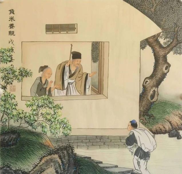 仲由,字子路,季路,春秋时鲁国人,孔子的得意弟子。性格直率勇敢,十分孝顺。早年家中贫穷,自己常常挖野菜做饭食,却从百里之外负米回家侍奉双亲,父母死后,他做了大官,奉命到楚国去,随从的车马百乘之众,所积的粮食有万钟之多。坐在垒雪的锦褥上,吃着丰盛的筵席,他常常怀念双亲,慨叹说:“即使我想吃野菜,为父母亲去负米,哪里能够再得呢。”孔子赞扬说:“你侍奉父母可以说生时尽力,死后思念啊。”